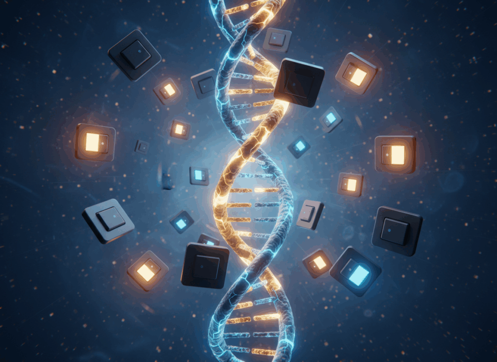 ここで関わってくるのが、エピジェネティクスという分野です。これは「遺伝子そのものではなく、その働き方(オン・オフ)が生活習慣や環境によって変わる」という仕組みを研究する領域です。テロメア(染色体の端の構造)がストレスや生活習慣によって短くなったり、瞑想や運動などでテロメラーゼ活性が変化したりする研究も報告されていますが、「意識だけで劇的に若返る」と言えるほどの証拠はまだありません。