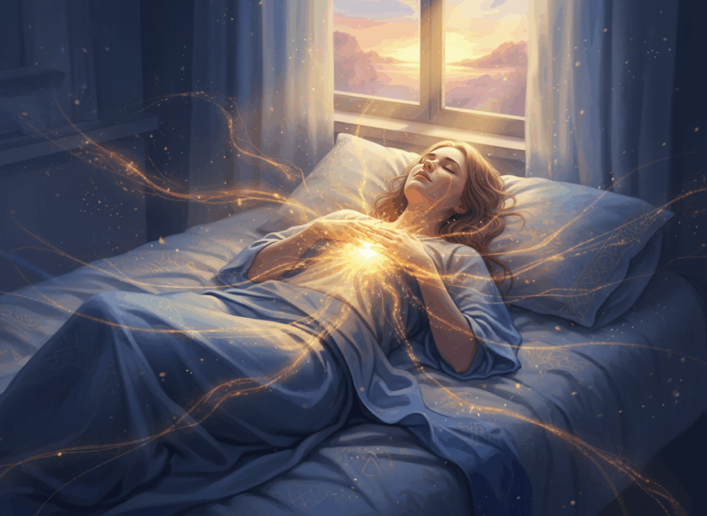 起きてすぐの脳は、まだ現実と夢の境目があいまいで、外からの情報が潜在意識に入りやすい状態だと考えられています。このタイミングで、深呼吸をしながら胸の中心に金色の光をイメージし、その光が全身に広がっていく感覚をゆっくり味わう——という手順です。